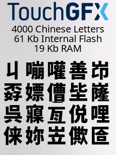 在該應用中,有4000個大小為20、每像素4位元的中文字元。 應用程式和資料佔用了STM32G071上128 Kb可用存儲空間中的61 Kb。 字體資料分配如下(不包括次要物件):