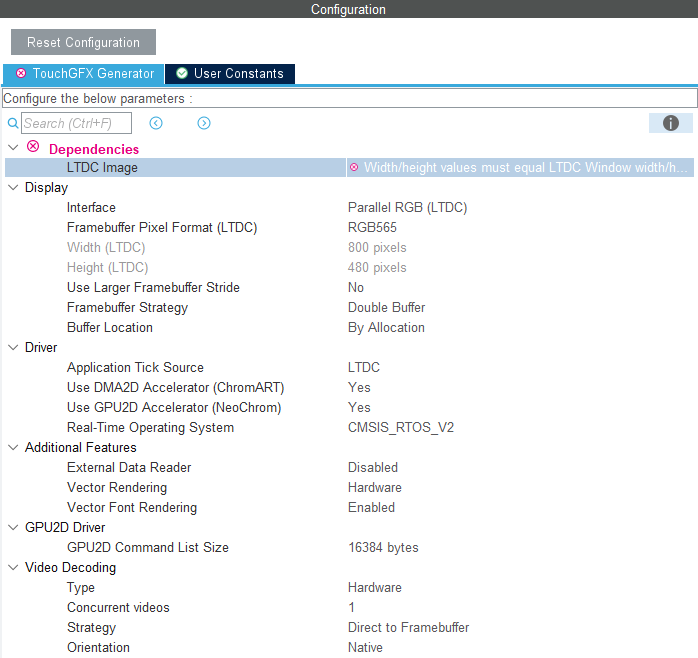 如果為專案啟用了TouchGFX Generator,X-CUBE使用者介面就會出現三個主要群組(Display (顯示)、Driver (驅動程式)及Video Decoding (影片解碼))。 第四個群組為「Dependencies」(相依關係),會在發現目前設定存在問題時出現。