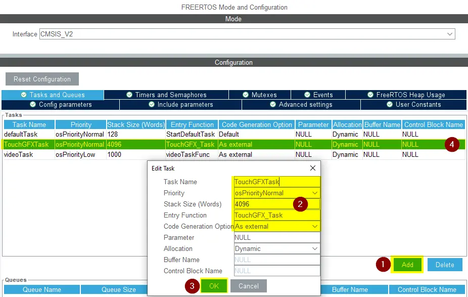 如果要利用FreeRTOS排程器排程此項工作,就必須在STM32CubeMX的FREERTOS選單中建立工作。 在Tasks and Queues (工作及佇列)索引標籤,新增工作以「TouchGFX_Task」作為Entry Function,並且要有夠大的堆疊,其中的Code Generation Option (程式碼產生選項)要設定為As external (外部)。