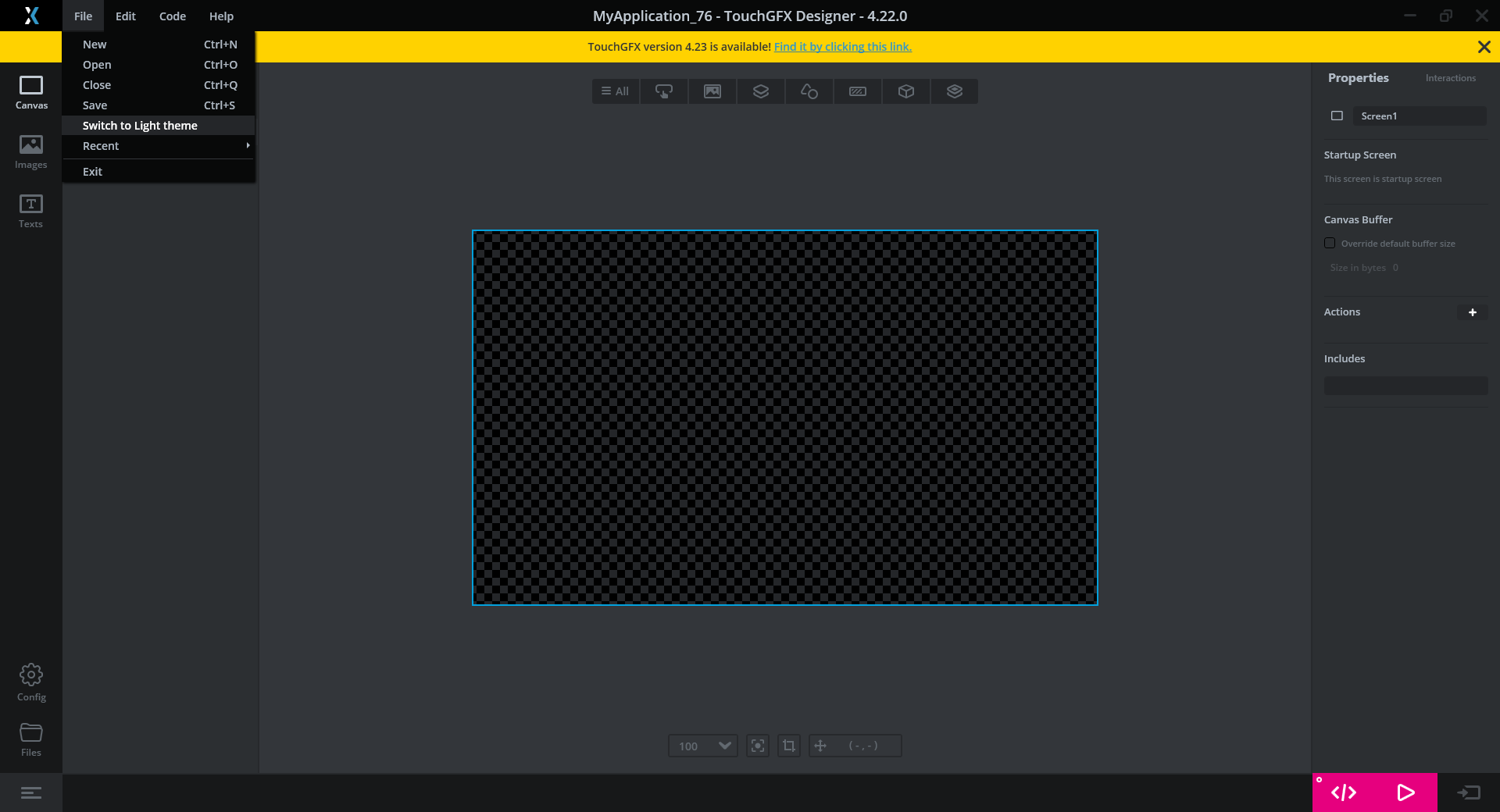 TouchGFX Designer supports a Light and Dark theme (see images below). 您可以在File Menu(檔案選單)中依據喜好切換主題。