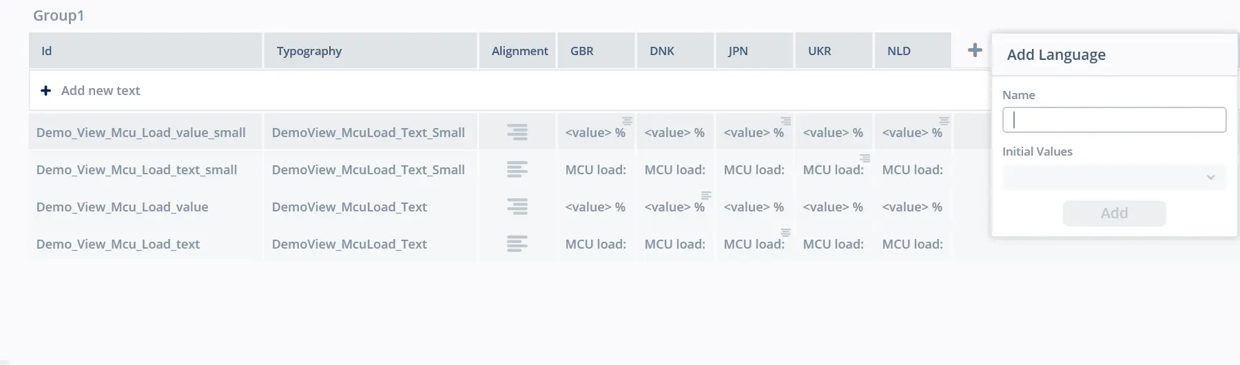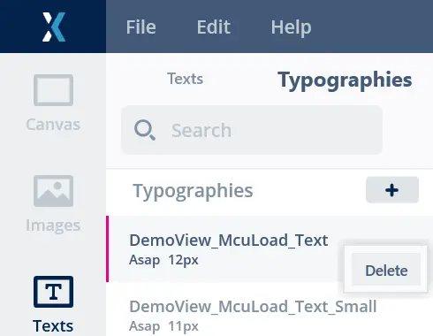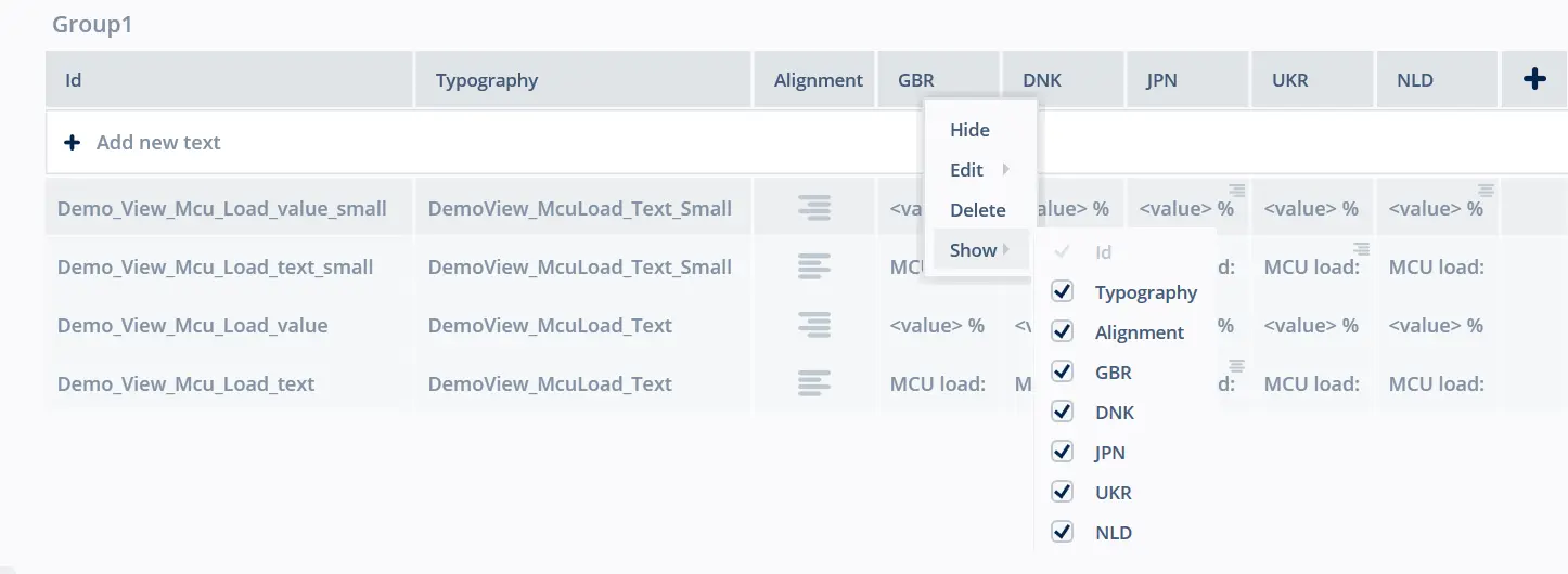 Texts with a defined ID (also known as Resources) can be reused on any number of widgets and actions in TouchGFX Designer. 要使用定義的ID新增新文字,請在Texts (文字)選項卡點擊標示為「Add new text」(新增新文字)的按鈕,或以自動產生ID為文字重新命名。 通過在網格或樹形視圖中選擇並點擊右鍵打開快顯功能表或使用鍵盤快速鍵,可在“文字”選項卡中刪除具有定義ID的一個或多個文字。