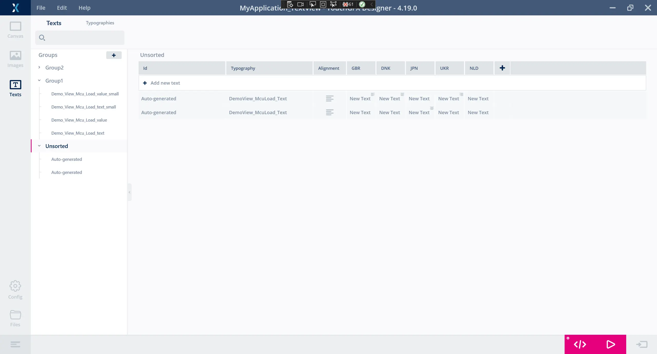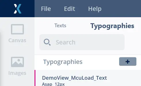 The Texts View in TouchGFX Designer is used for configuring texts, translations and typographies in a project. 該視窗包含兩個選項卡:文字和字體排印。