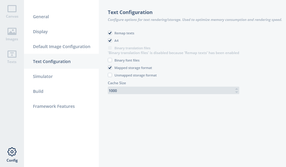 The cache size can be configured in TouchGFX Designer. 選擇設定分頁中的 「文字設定」:
