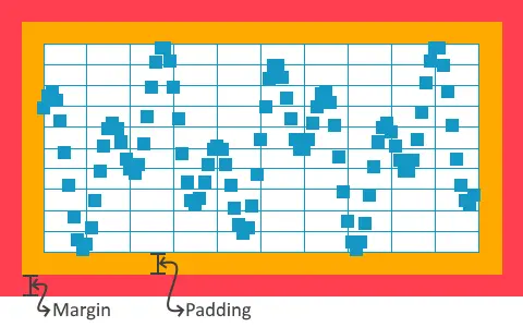 在下圖中,橙色區域表示在右側、頂部、左側和底部各添加了20圖元的填充。 它還顯示“方框”元素是如何被允許繪製到已填充區域的。