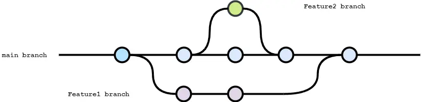 在此範例中,由主分支建立了兩個分支。 Feature2分支先合併至主分支之中。 如果也在主分支進行工作,這就可能會產生合併衝突。 稍後Feature1分支合併至主分支。 如果兩個特徵分支對相同檔案進行變更,就可能會產生衝突。