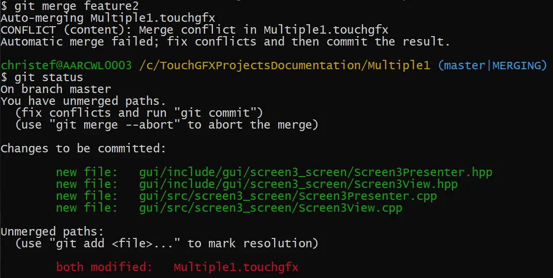feature2分支及主分支都變更了.touchgfx檔案,而git無法合併變更。 這是因為兩個分支都是在Screen1之後新增螢幕: